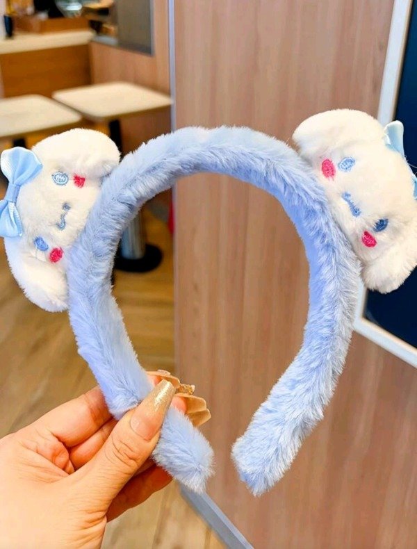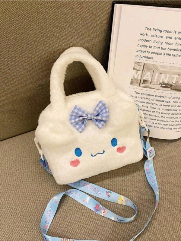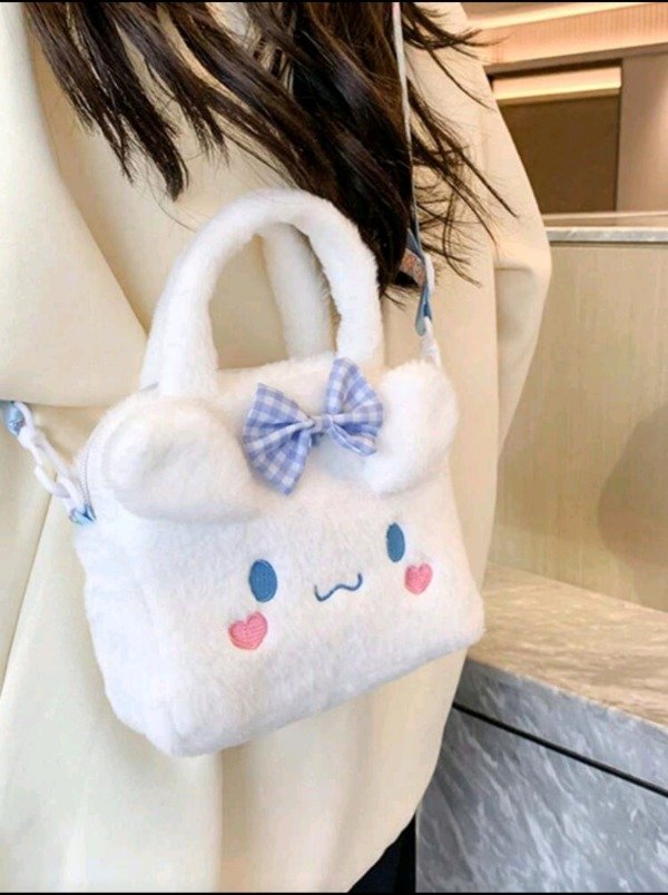 👜 Cartera/bolso de peluche Cinnamoroll con moñito celeste y detalles bordados.