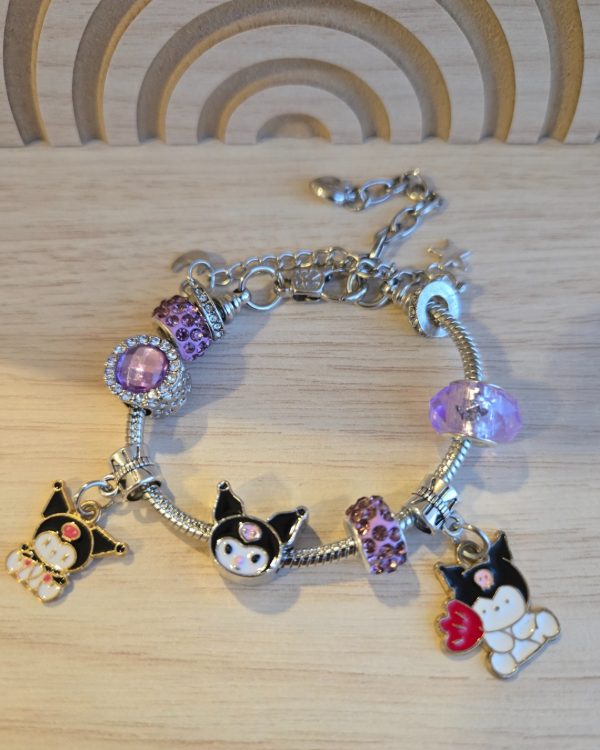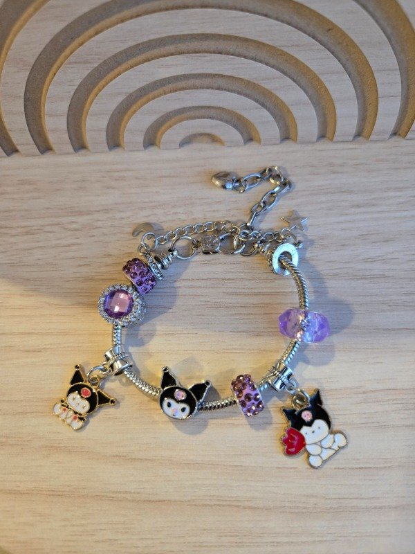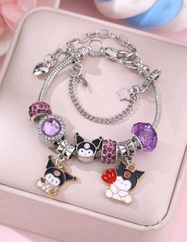 Pulsera importada estilo Pandora de diseño exclusivo con charms de Kuromi, combinados con detalles en esmalte y símil cristales en tonos lilas y plateados. Incluye dijes colgantes temáticos y cuentas brillantes que le dan un estilo único y divertido.
