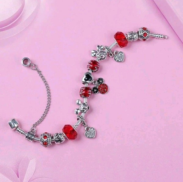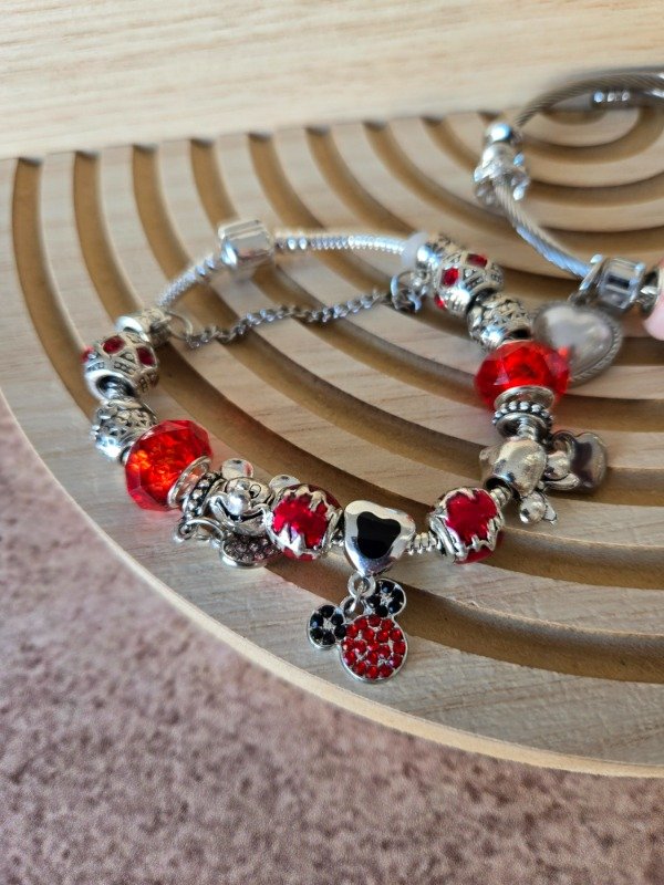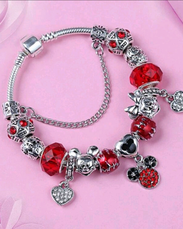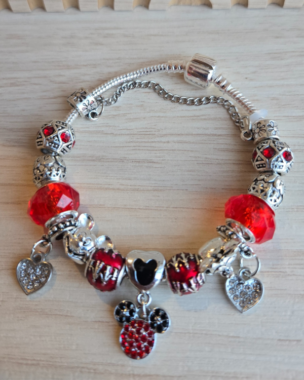 Pulsera importada estilo Pandora con dijes de Mickey Mouse, corazones y símil cristales rojos.