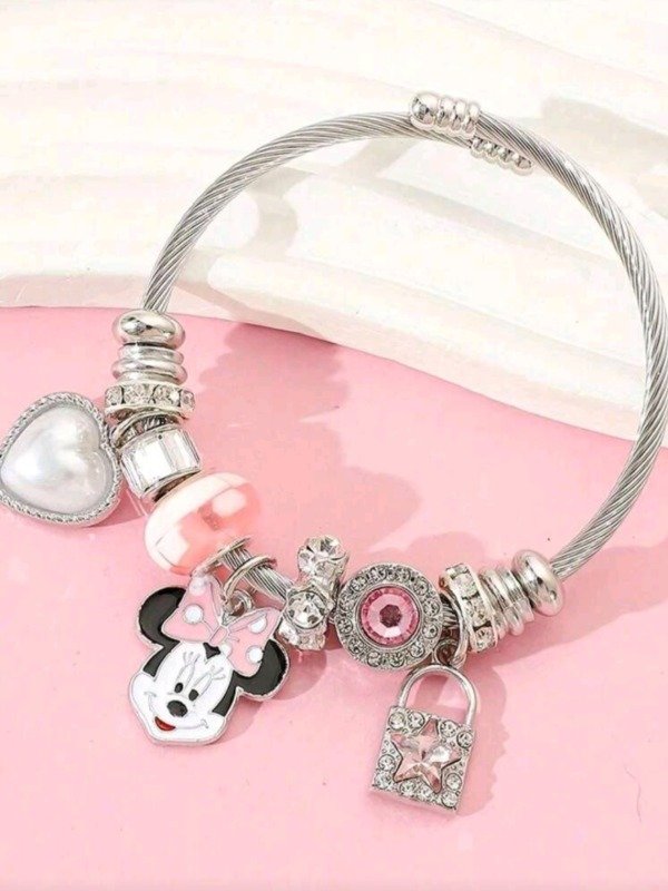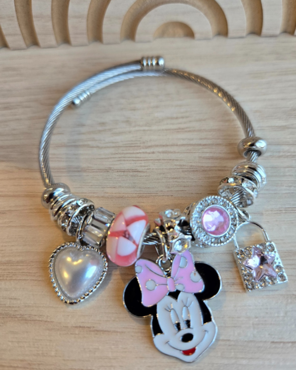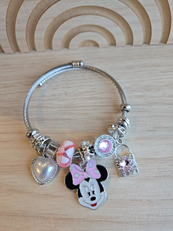 Pulsera rígida estilo Pandora con dijes inspirados en Minnie Mouse, combinada con símil cristales rosa y detalles en plateado.