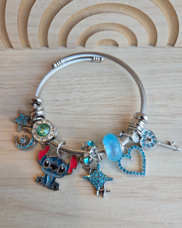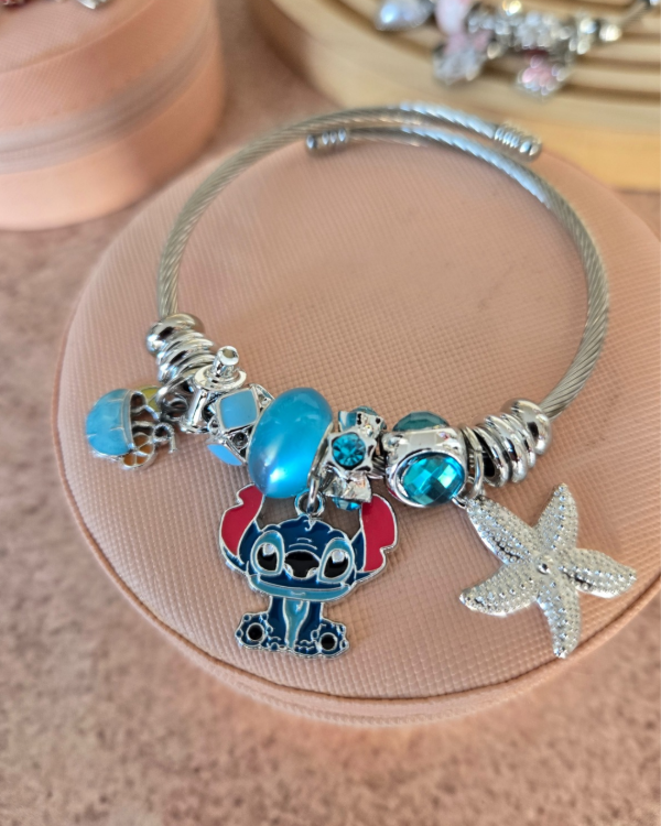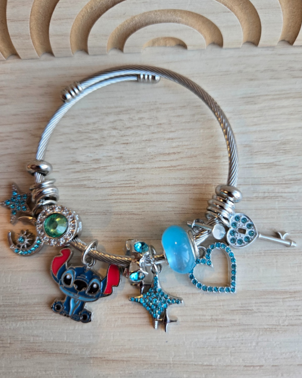 Pulsera rígida importada tipo Pandora con diseño inspirado en Stitch, ideal para quienes aman los detalles únicos y coloridos. Incluye dijes metálicos con símil cristales azules y figuras de estrellas, corazones y el personaje principal.