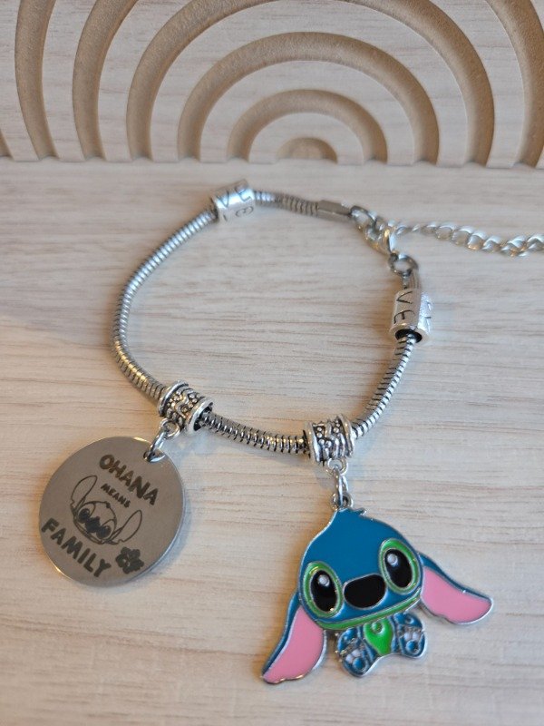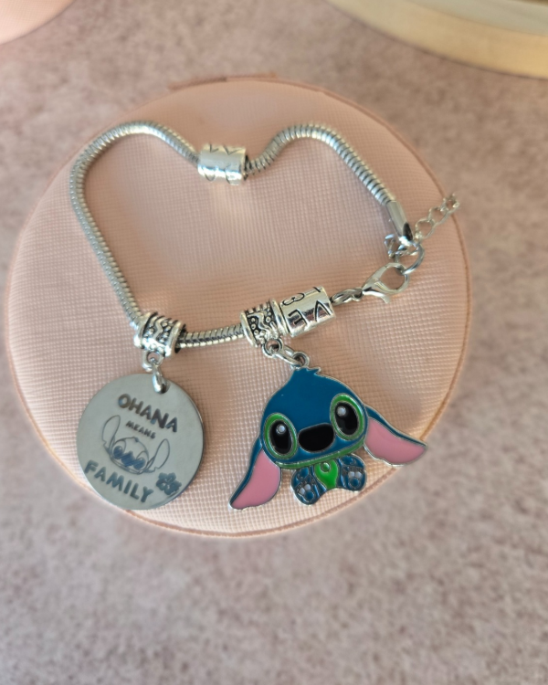Pulsera tipo Pandora con dije de Stitch y medalla grabada con la frase “Ohana means Family”, símbolo de amor, unión y amistad. Fabricada en aleación metálica con baño plateado, es ideal para regalar o sumar a tu colección de accesorios con encanto.
