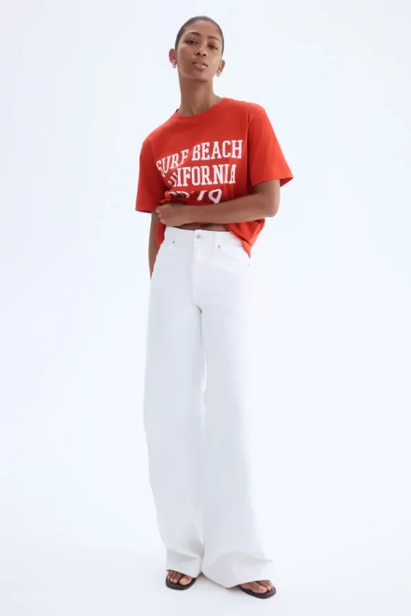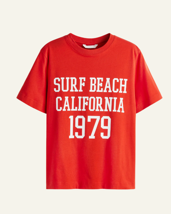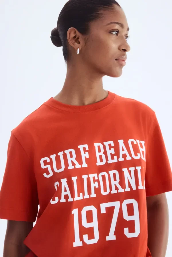 Remera H&M de mujer confeccionada en algodón suave, ideal para un look cómodo y relajado. Presenta estampado frontal “Surf Beach California 1979”, que aporta un estilo casual con inspiración californiana.