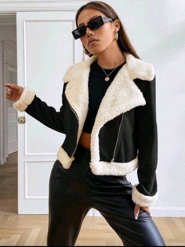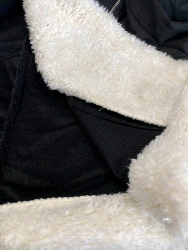 Confeccionada en gamuza sintética suave por fuera, con detalles de corderito únicamente en el cuello, solapas y bordes, tal como se ve en las imágenes.