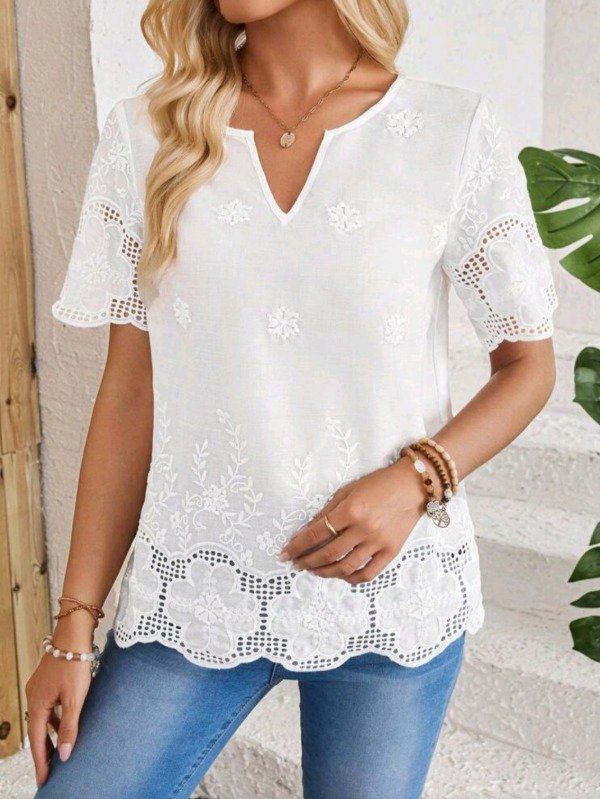 Blusa Emery Rose confeccionada en tela ligera con delicados bordados florales y detalles de encaje calado en las mangas y el ruedo.
