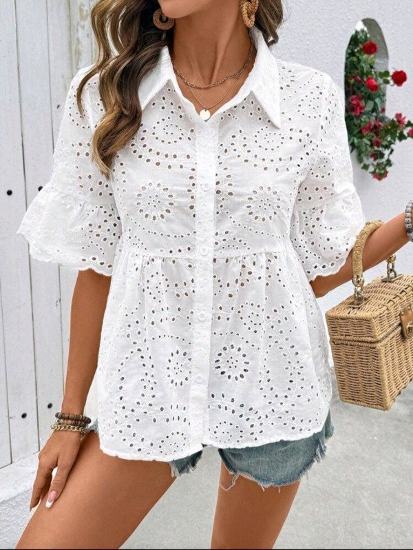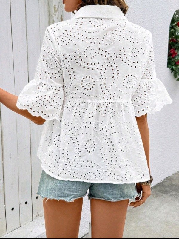 Blusa importada confeccionada en tela tipo broderie de algodón, con diseño calado floral y mangas cortas acampanadas.