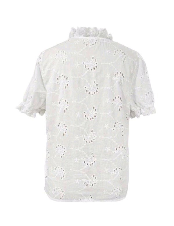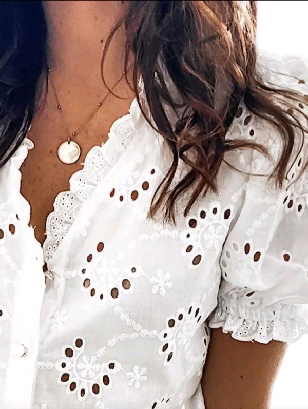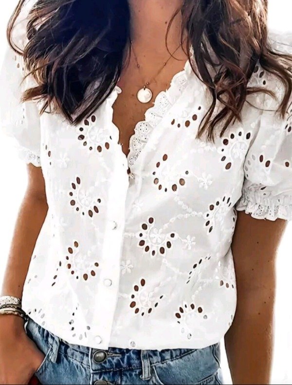 Blusa femenina de diseño romántico y fresco, confeccionada en tela bordada con calado floral.