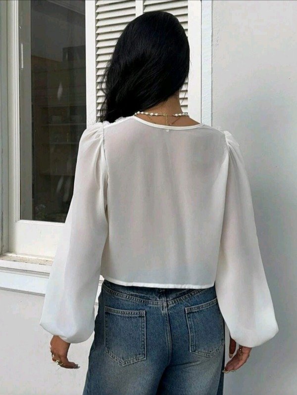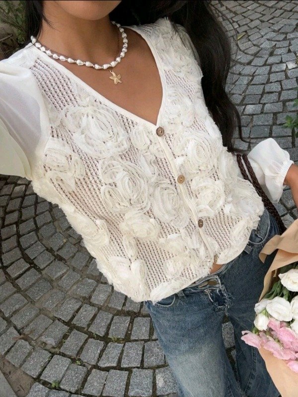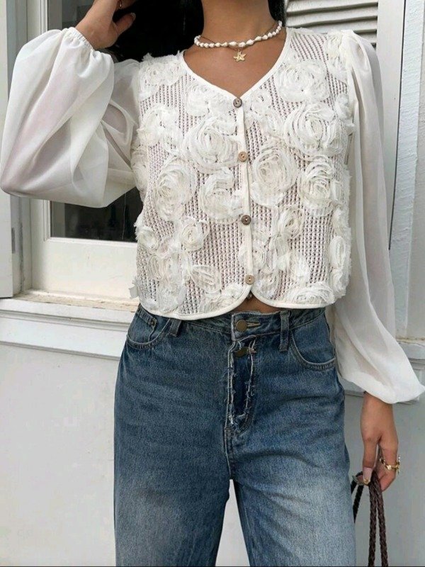 Presenta cuello en V, manga farol translúcida y botonadura frontal, con una textura bordada en relieve que resalta por su elegancia y feminidad.