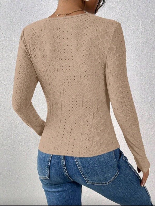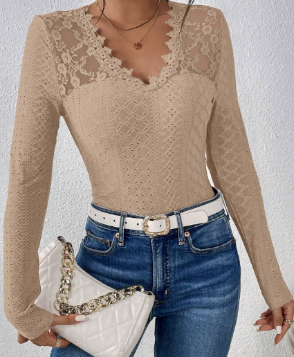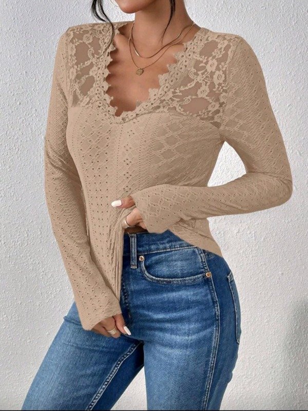 Blusa femenina, delicada y súper elegante, con una combinación hermosa de tejido calado y paneles de encaje que resaltan el escote y los hombros.