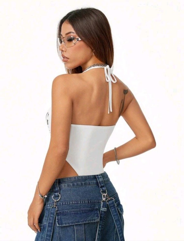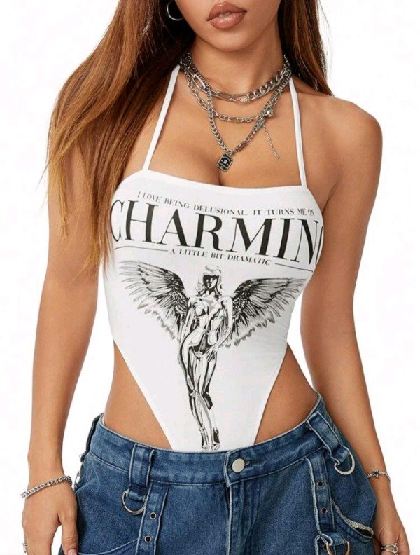 Dale un toque atrevido y urbano a tus outfits con este body blanco con estampado “Charmin” y ángel. Su diseño ajustado realza la figura y el escote tipo halter aporta un estilo moderno y llamativo. Ideal para combinar con jeans, faldas o pantalones cargo y crear looks únicos tanto de día como de noche.