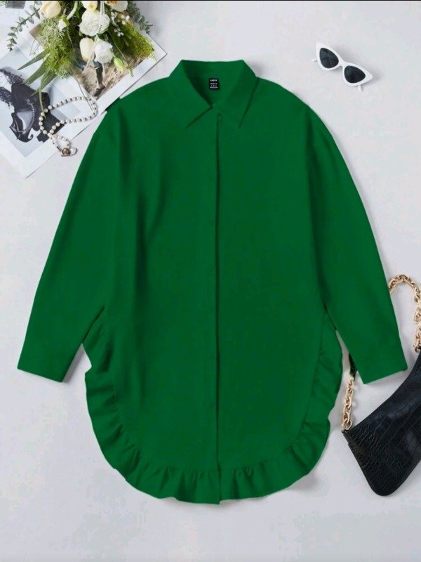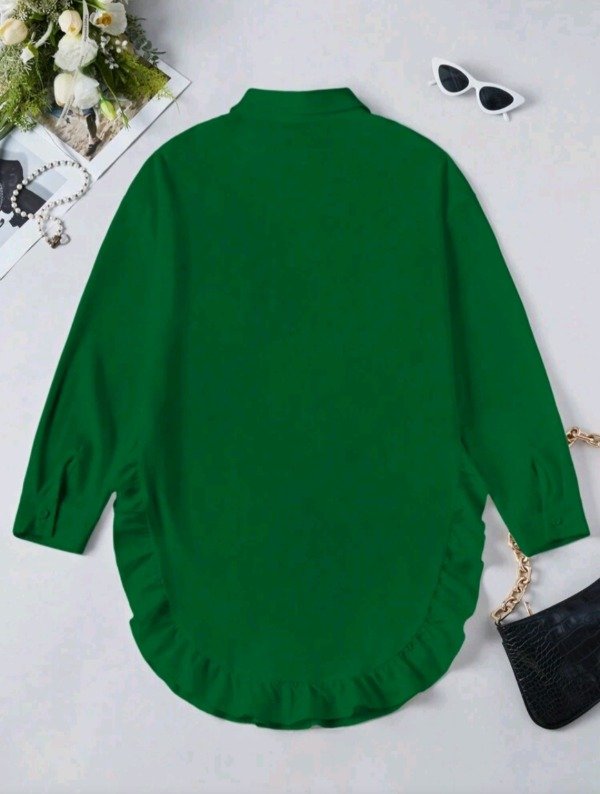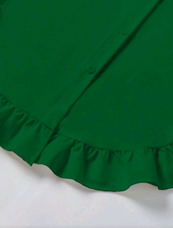 Posee manga larga con hombros caídos, cuello camisero y volados en el ruedo, que aportan un toque romántico y elegante.