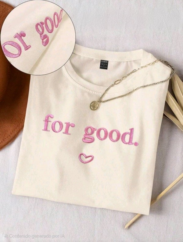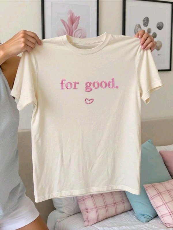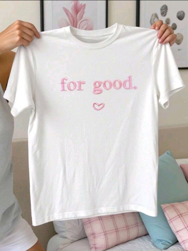 Presenta un diseño simple y delicado con la frase bordada “for good.” en tono rosa pastel, que aporta un estilo romántico y minimalista.