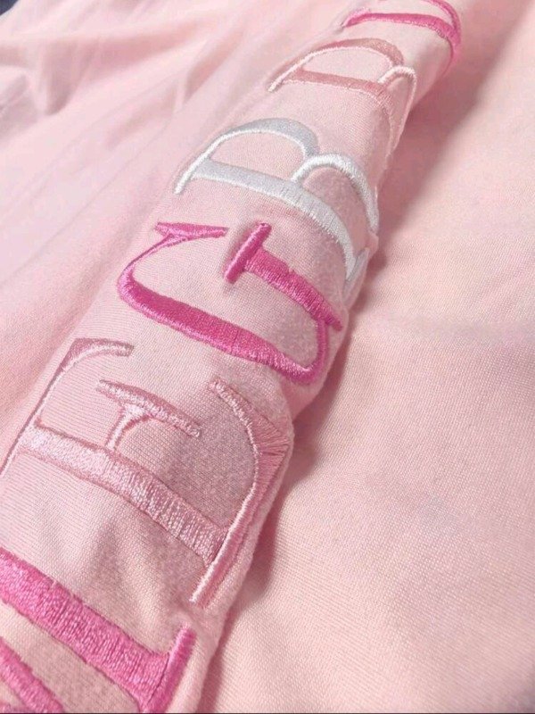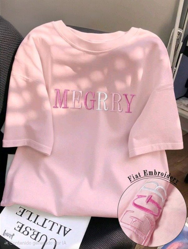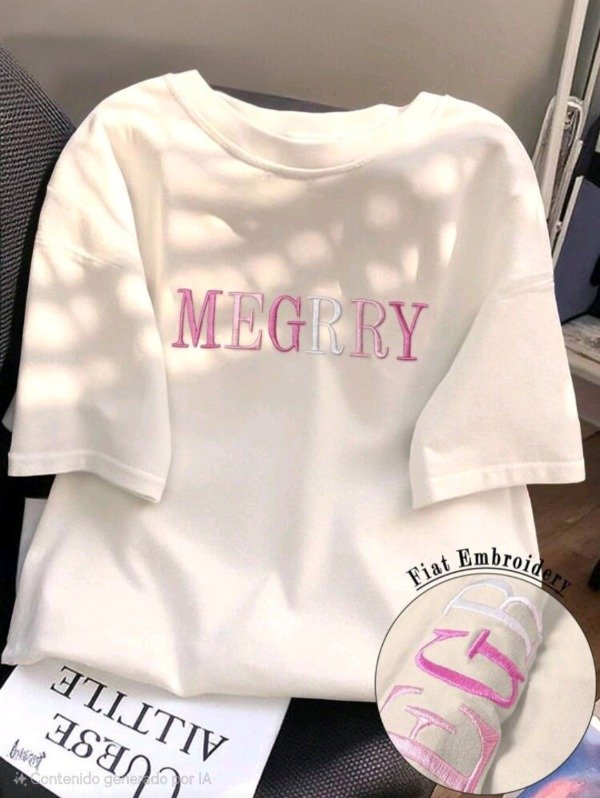 Tiene manga corta, cuello redondo y un delicado bordado en relieve con la palabra “MEGRRY” en tonos rosados y blancos que le da un toque moderno y divertido.