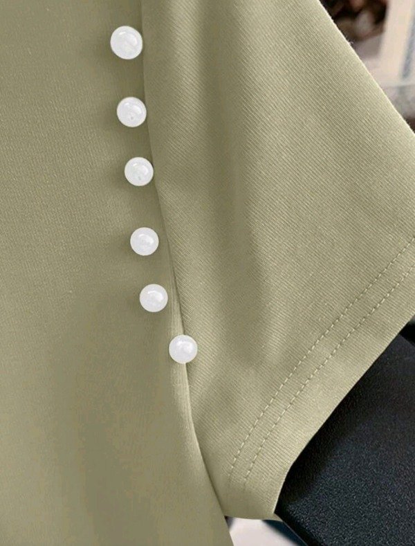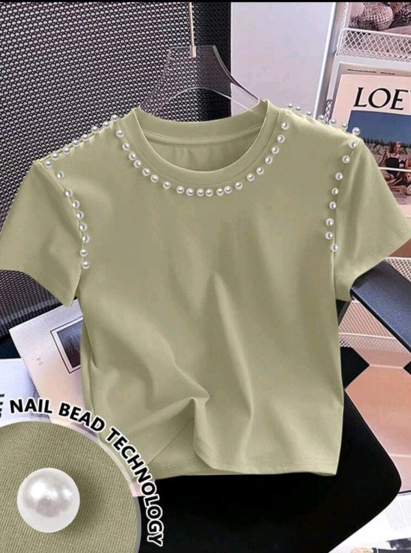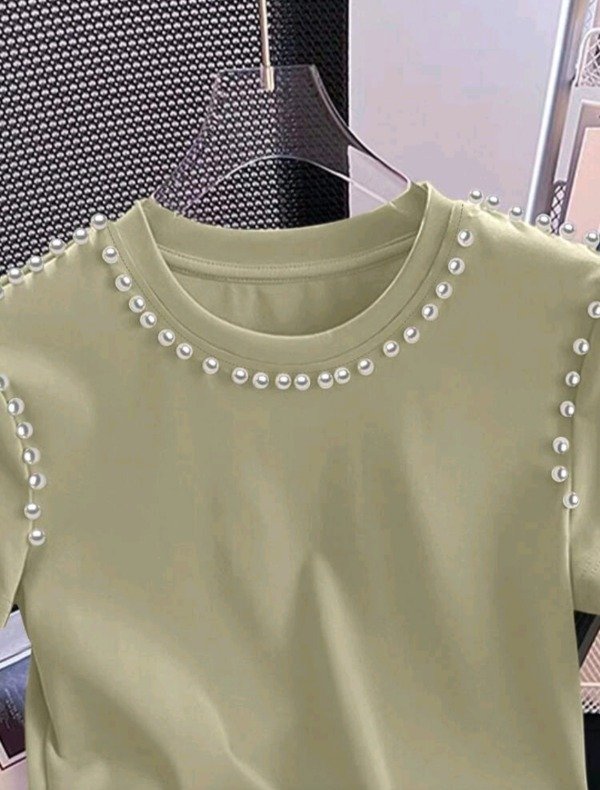 Remera femenina de verano confeccionada en tejido suave con leve elasticidad, que brinda comodidad y un calce perfecto.Presenta cuello redondo, mangas cortas y delicados detalles de tachas tipo perlas en el cuello y hombros, aportando un toque elegante sin perder su estilo casual.