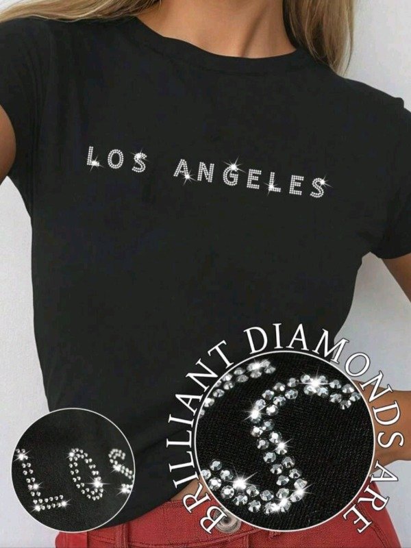 Presenta el texto “LOS ANGELES” decorado con apliques de strass brillantes, que aportan un toque moderno y glam.