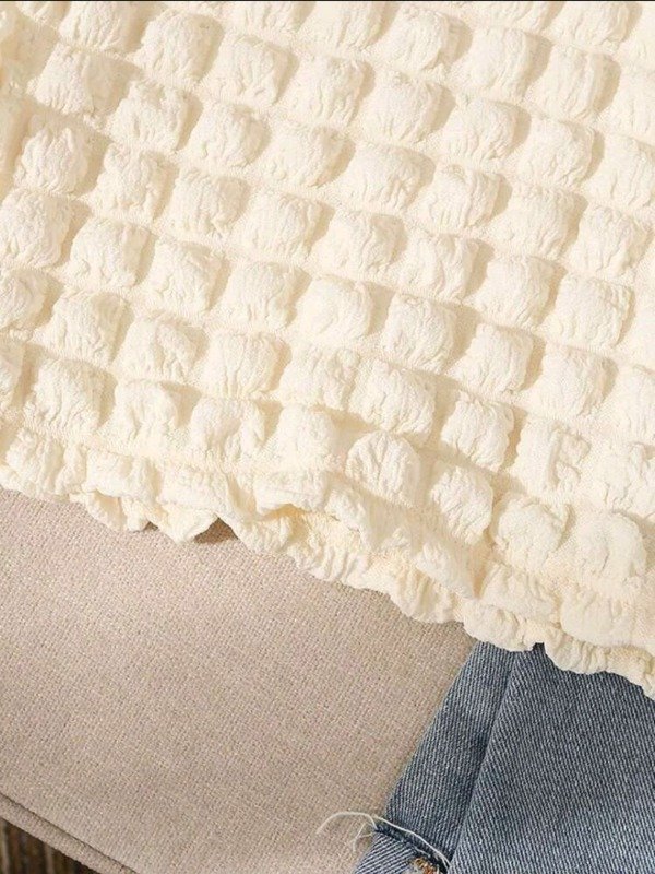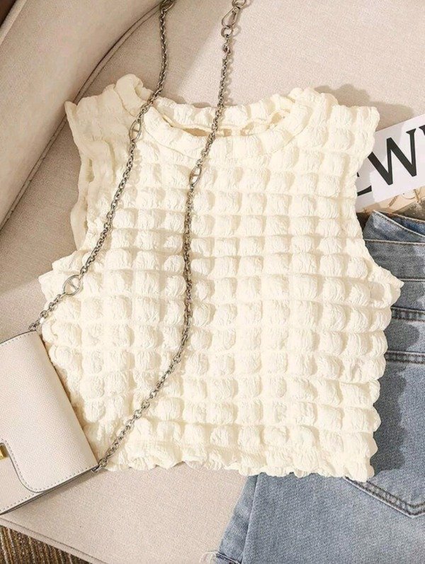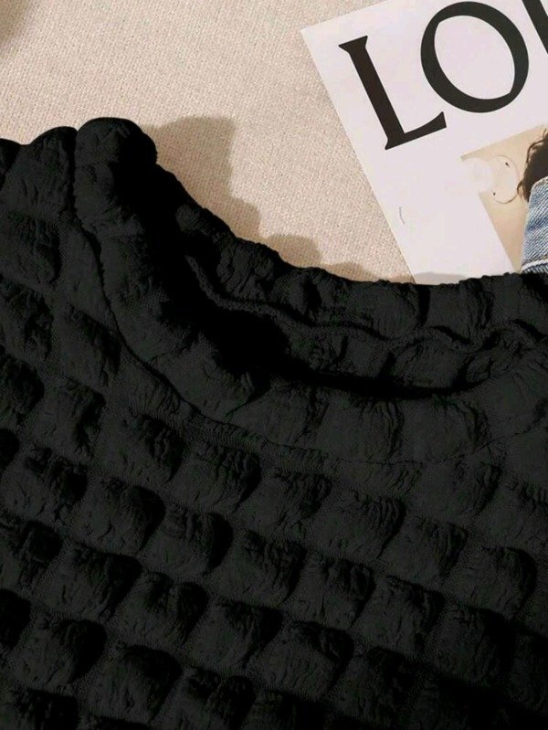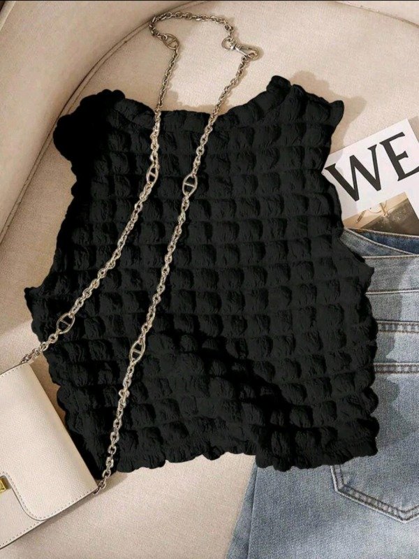 Su cuello redondo y textura fruncida crean un efecto visual único que realza cualquier outfit, ya sea casual o más elegante.