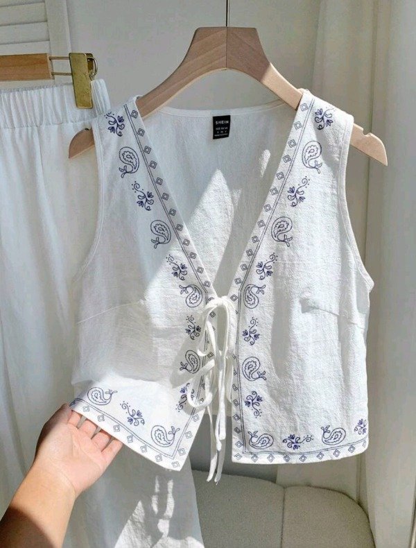 Conjunto importado Confortcana, confeccionado en algodón 100% suave y respirable, con bordado artesanal en hilo azul.Incluye chaleco sin mangas con lazo frontal ajustable y pantalón ancho de cintura elástica, ideal para un look natural, boho y cómodo.