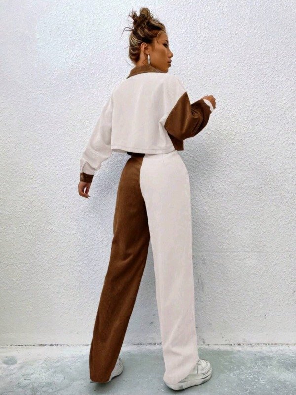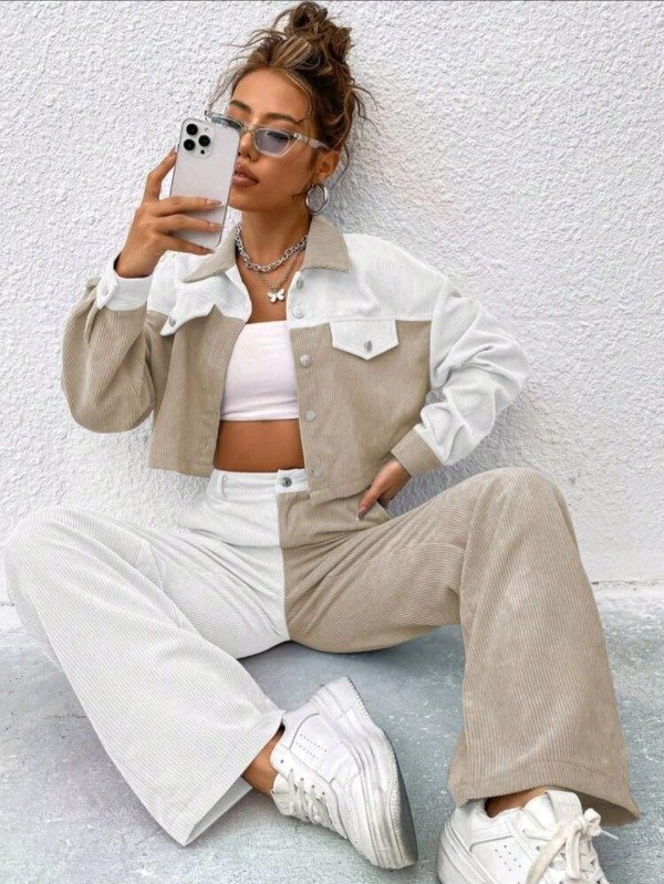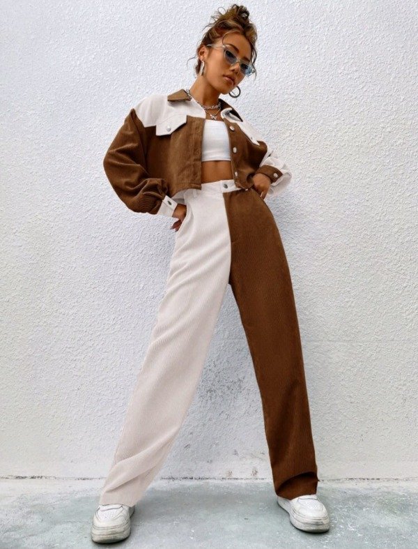 La campera corta combina dos tonos en contraste con hombros caídos, y el pantalón de tiro alto estiliza y aporta una comodidad increíble.
