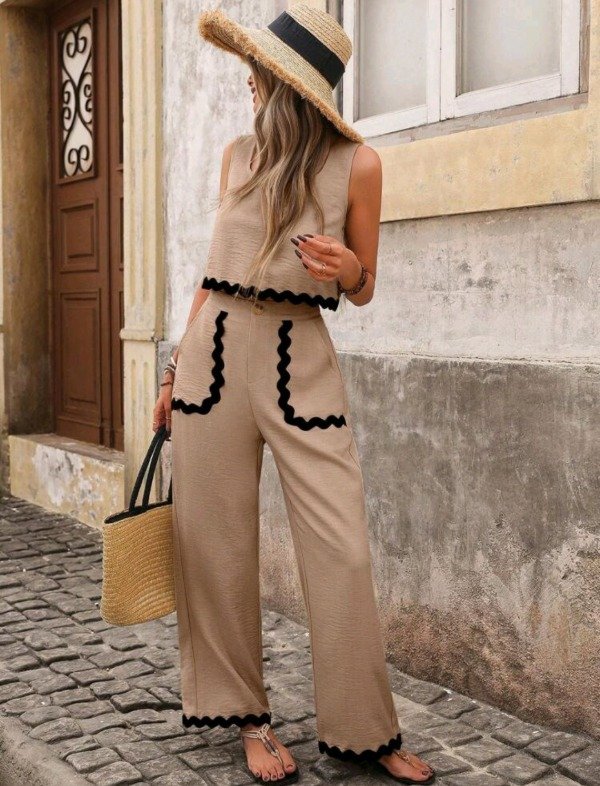 👗 Corte: Top recto con cuello cuadrado + pantalón palazzo tiro alto.