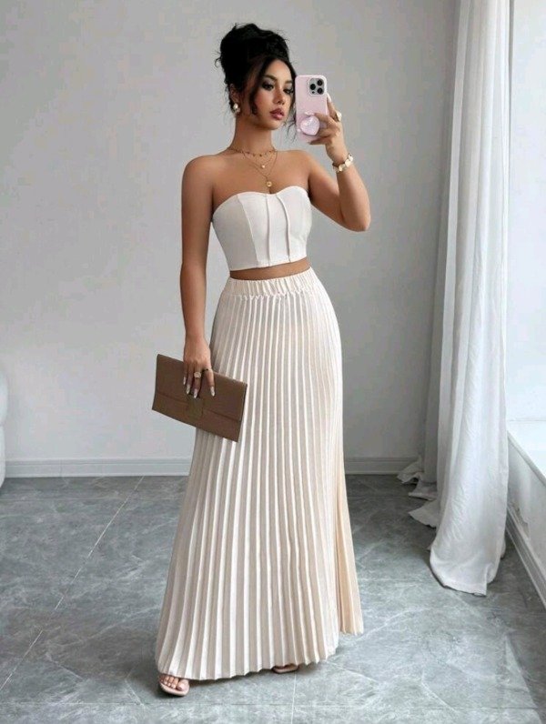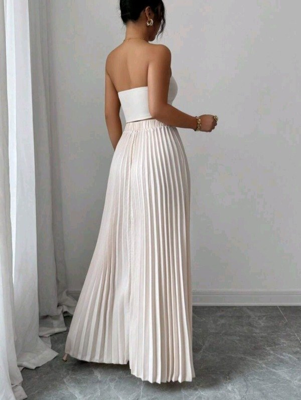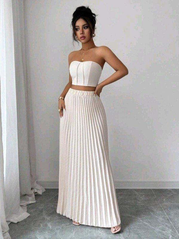 Set femenino INAWLY compuesto por un top bandeau sin tirantes y una falda larga plisada con caída elegante y movimiento fluido.