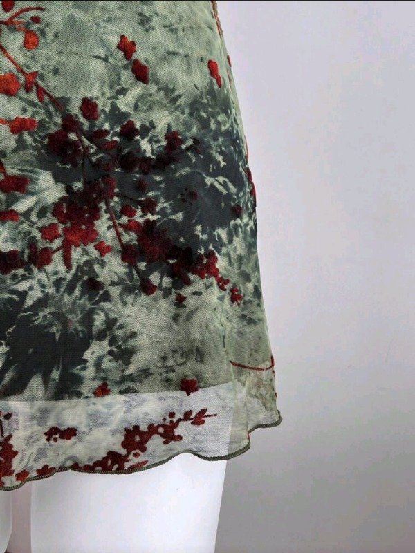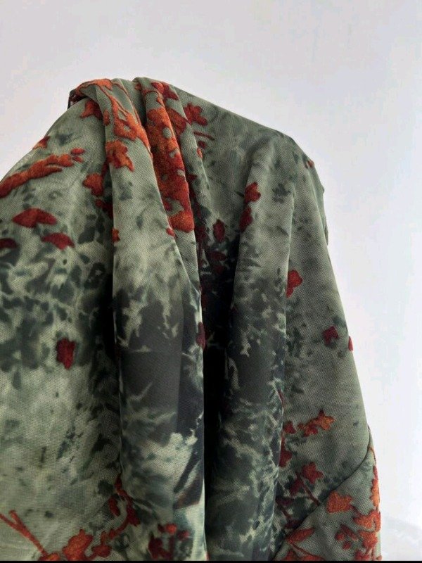 Vestido Elamini confeccionado en tejido suave con textura tipo terciopelo y diseño floral en tonos tierra y verdes.