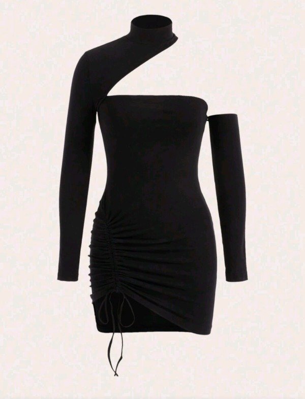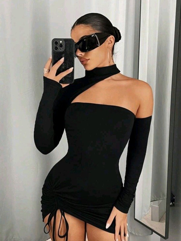 Vestido Shein ICON confeccionado con más de 70% algodón, suave y elástico para un calce perfecto. De diseño asimétrico con un hombro descubierto, manga larga y detalle de frunce ajustable lateral con cordón que realza la figura. Ideal para un look de noche moderno, elegante y con mucho estilo.