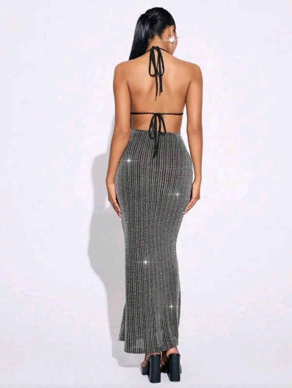 Vestido Shein SKY de diseño impactante, ideal para noches especiales. Su tejido con brillo efecto diamante y su corte al cuerpo generan una silueta súper estilizada y elegante.