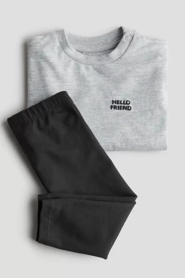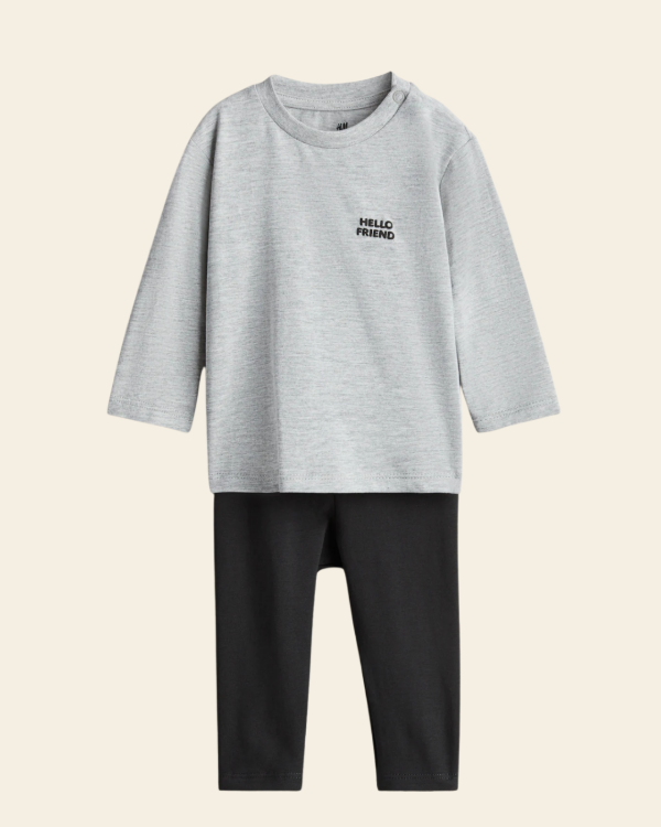 Conjunto H&M para bebéideal para el uso diario. Incluye remera manga larga en color gris con bordado “Hello Friend” y pantalón liso en color negro, formando un outfit cómodo y moderno.