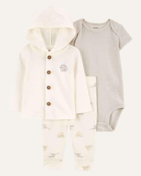 Dale ternura y comodidad a tu bebé con este set original Carter’s de 3 piezas, ideal para usar en cualquier ocasión. Incluye un body de manga corta, un pantalón estampado con elástico cómodo y una chaquetita con capucha y botones frontales, todos confeccionados en algodón suave y respirable.