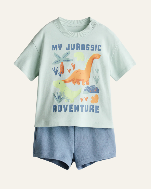 Incluye remera celeste con divertida estampa de dinosaurios y short azul con cintura elástica para un ajuste cómodo.