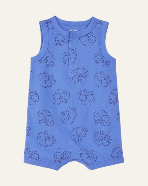 Enterito sin mangas de Carter’s, ideal para el verano. Confeccionado en suave algodón, ofrece frescura y comodidad durante todo el día. Su divertido estampado de cangrejos y el color azul vibrante le dan un estilo playero único. Cuenta con broches resistentes en la entrepierna que facilitan los cambios de pañal.
