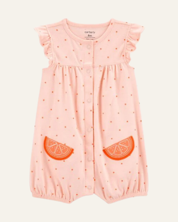 Un enterito adorable y lleno de dulzura, con estampado de lunares y naranja en tonos suaves y diseño cómodo para tu bebé. Fabricado en algodón acanalado suave, incluye mangas con volado y broches completos para cambios fáciles y rápidos. Una prenda fresca, práctica y tierna, ideal para el día a día.