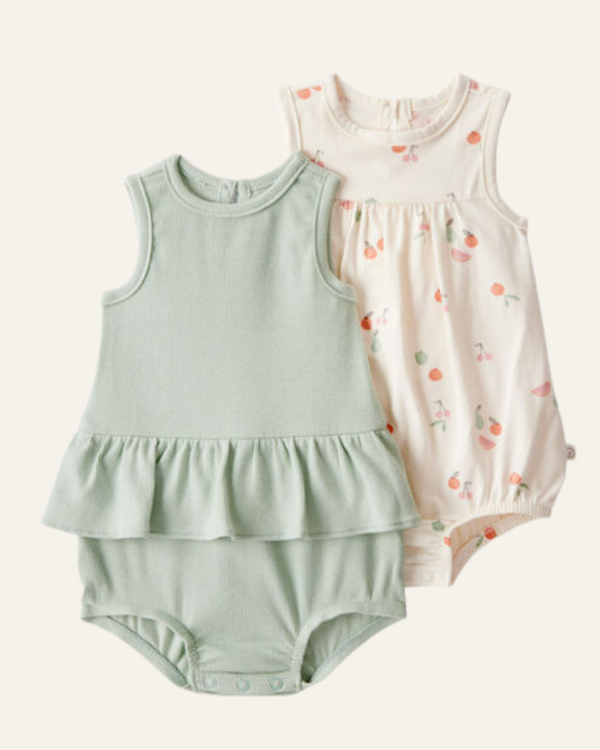 Incluye un modelo verde menta con volado en la cintura y otro estampado con frutas en tonos suaves.