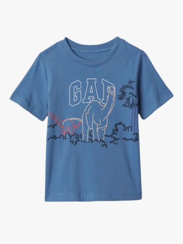 Remera infantil original de GAP, ideal para los peques que aman los diseños divertidos. Modelo de manga corta y cuello redondo, con estampa frontal de dinosaurios y logo GAP, que suma un toque lúdico y moderno al look diario.