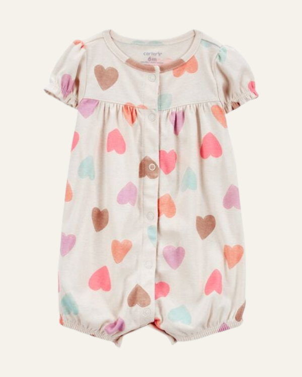 Este adorable romper Carter’s para bebé niña está lleno de dulzura con su estampado de corazones en tonos suaves y vibrantes. Confeccionado en algodón acanalado ultra suave, cuenta con mangas cortas tipo flutter y práctico diseño con broches a lo largo del frente, lo que lo convierte en una prenda fácil de poner y quitar.