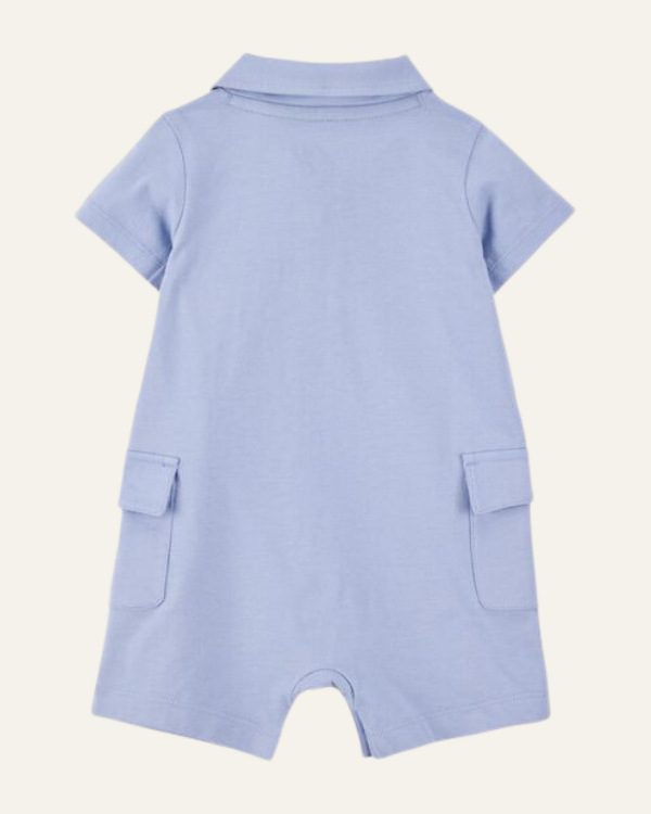 Tiene mangas cortas, cuello tipo polo con botones frontales y broches en la entrepierna que facilitan el cambio del bebé.