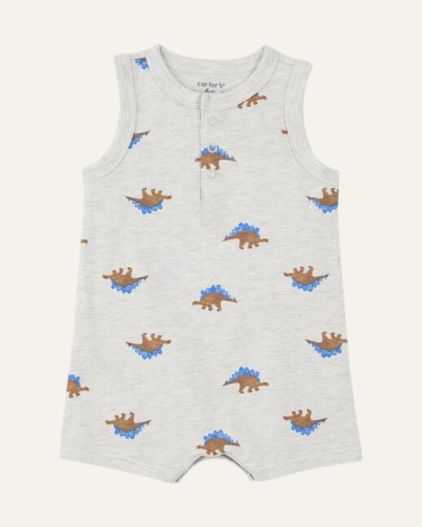 El romper sin mangas Baby Dinosaur de Carter’s es ideal para el verano: fresco, cómodo y lleno de estilo. Confeccionado en un suave algodón blend, tiene un divertido estampado allover de dinosaurios marrones con detalles azules que encantará a tu bebé. Su diseño sin mangas permite total libertad de movimiento, mientras que los broches a presión en la entrepierna facilitan los cambios rápidos.