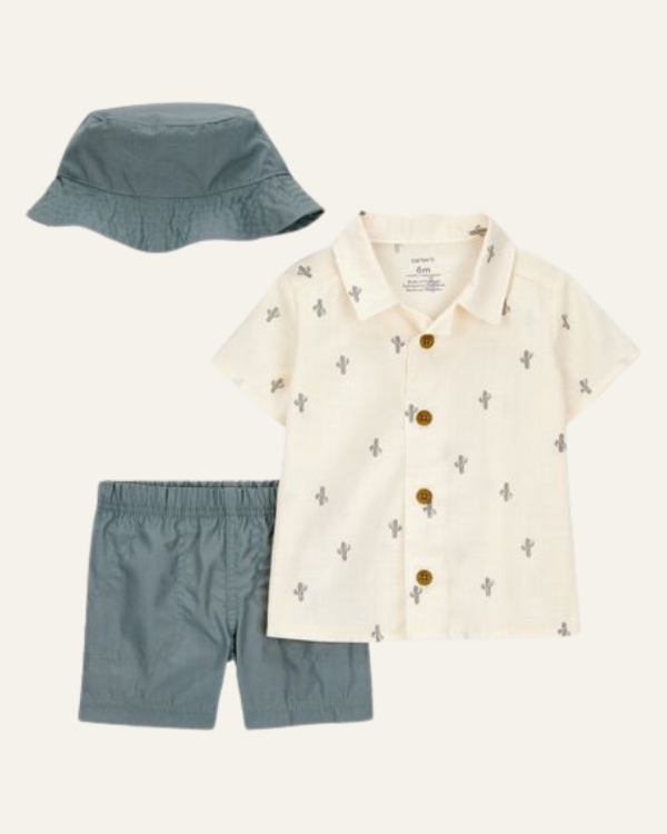 Incluye una camisa con botones de madera y estampado de cactus, un short con cintura elástica y un sombrerito al tono, combinando comodidad y estilo para tu bebé.