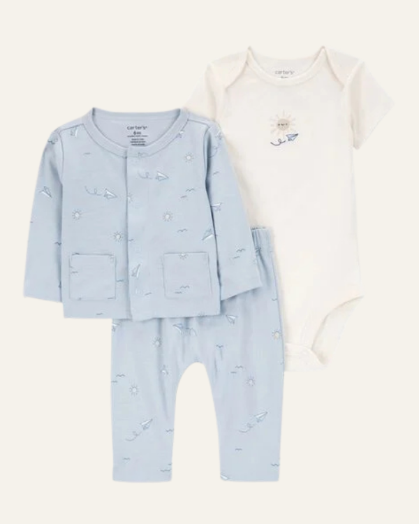 Un conjunto clásico y práctico de 3 piezas de la marca Carter’s, ideal para el guardarropa de tu bebé. Incluye un cardigan con botones al frente, un body de manga corta con hombros superpuestos para vestir fácilmente, y un pantalón cómodo con cintura elástica. Todo confeccionado en algodón suave, perfecto para mantener a tu pequeño abrigado y cómodo durante todo el día.