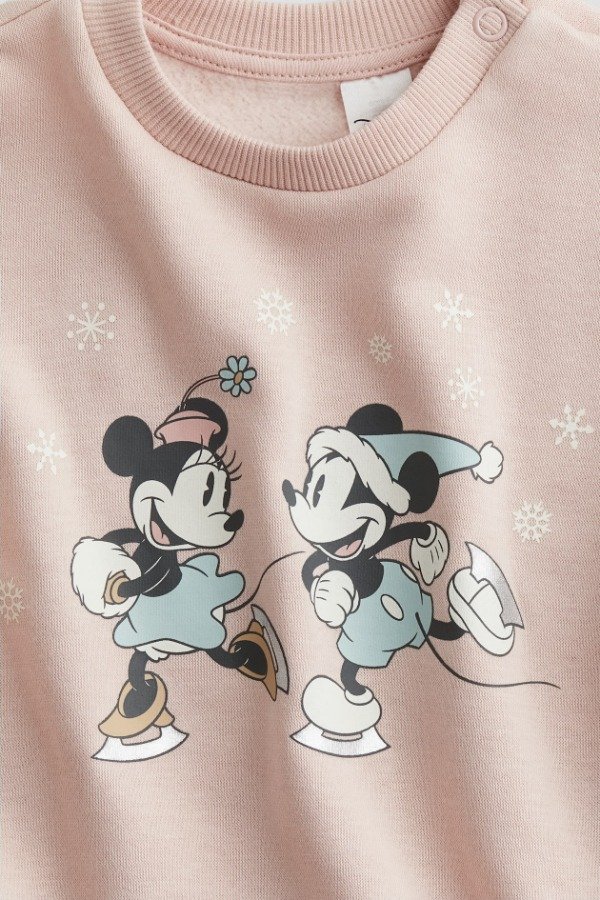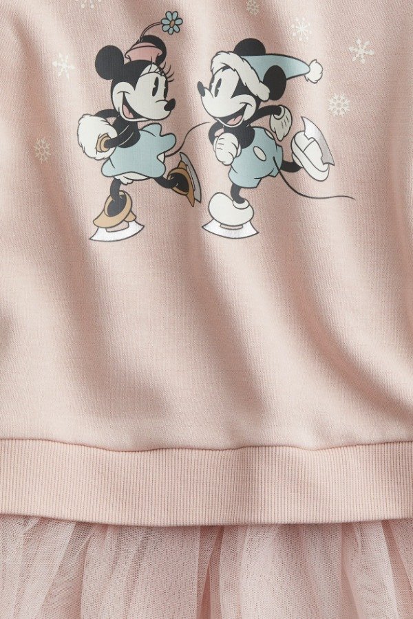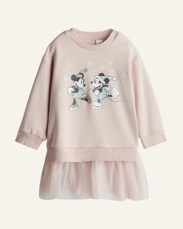 Vestido H&M para niña tipo buzo, confeccionado en algodón suave con interior confortable, ideal para los días frescos. Presenta estampa frontal de Minnie y Mickey Mouse con detalles invernales, que le aportan un estilo tierno y delicado.