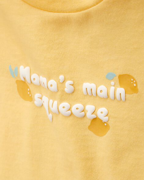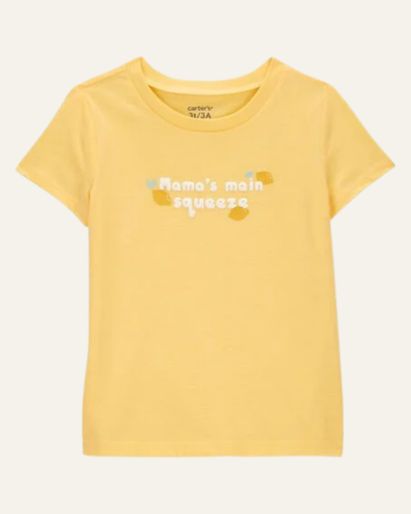 Dulce, divertida y cómoda: esta remera de Carter’s está pensada para las más pequeñas que son el centro de atención de mamá 💛. Confeccionada en algodón suave, de color amarillo vibrante y con la frase estampada “Mama’s Main Squeeze”acompañada de limoncitos, combina estilo con ternura en cada detalle. Ideal para usar sola en días cálidos o para superponer en climas más frescos.