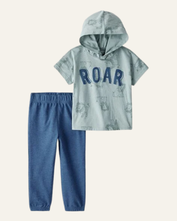 El conjunto de 2 piezas Carter’s para niño es ideal para jugar, pasear o disfrutar en casa con comodidad y estilo. Incluye una remera de manga corta con capucha, estampado de leones y la palabra “ROAR” en el frente, combinada con un pantalón jogger azul con cintura elástica cubierta para un ajuste perfecto.