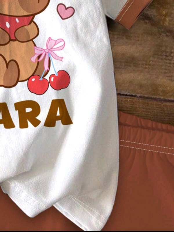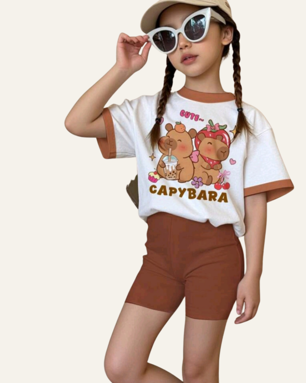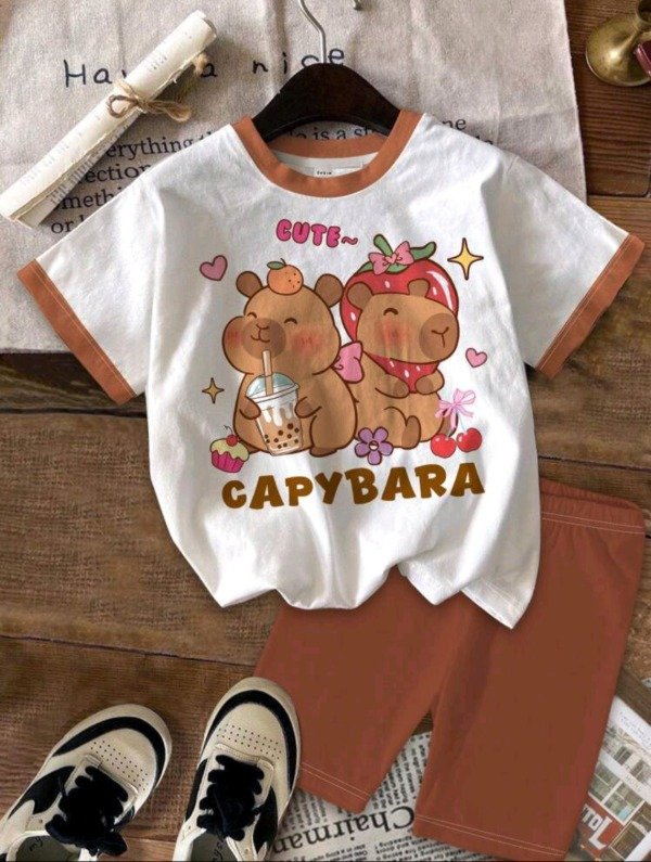 El set Shein original para niña incluye remera y short, con un diseño divertido y tierno inspirado en carpinchos (capybara). Ideal para uso diario o para regalar, combina comodidad con un estilo moderno y alegre.