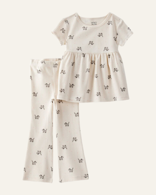 Conjunto OshKosh B’gosh de 2 piezas para niña, confeccionado en algodón suave y acanalado. Incluye remera de manga corta con cuello redondo, detalle peplum y tierno estampado de perritos en toda la prenda. Se combina con un pantalón pull-on de pierna ancha y cintura elástica cubierta, ideal para brindar comodidad y estilo en cualquier momento del día.