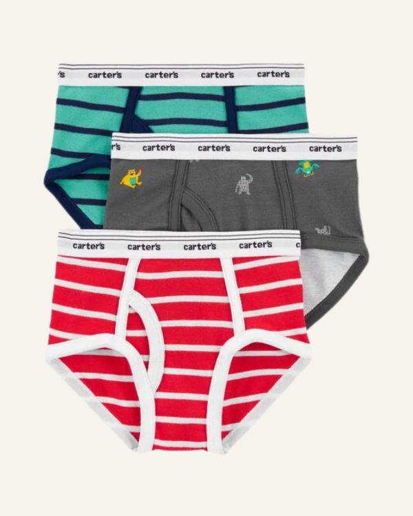Pack de 3 slips Carter’s para niño, confeccionadas en algodón suave y respirable, ideales para el uso diario.