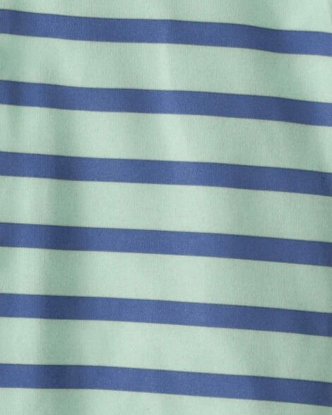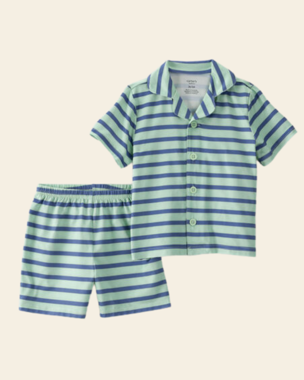 Incluye camisa con botones y cuello camisero + short con cintura elástica, ambos en diseño rayado clásico en tonos verde menta y azul.