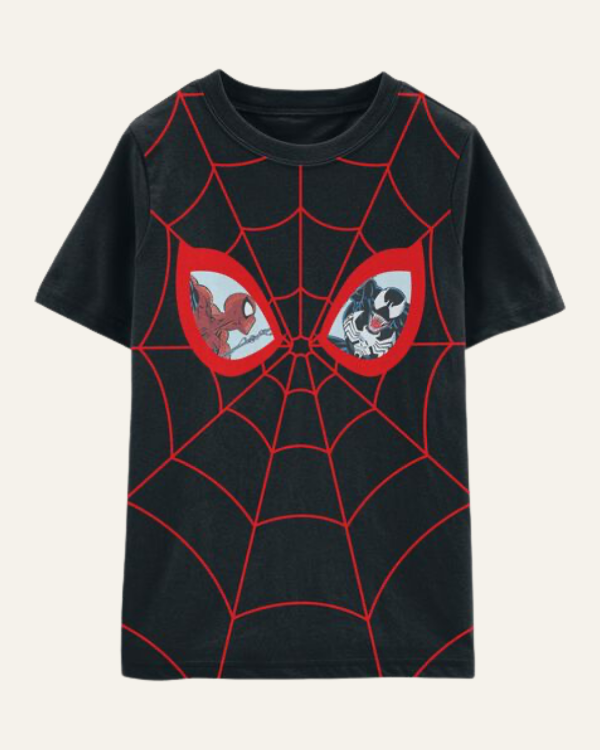 Tu pequeño héroe va a adorar esta remera de Spider-Man original de Carter’s. Con diseño gráfico en color negro, telaraña en rojo y detalles de los personajes en los ojos, es una prenda única y súper canchera para los fans de Marvel.