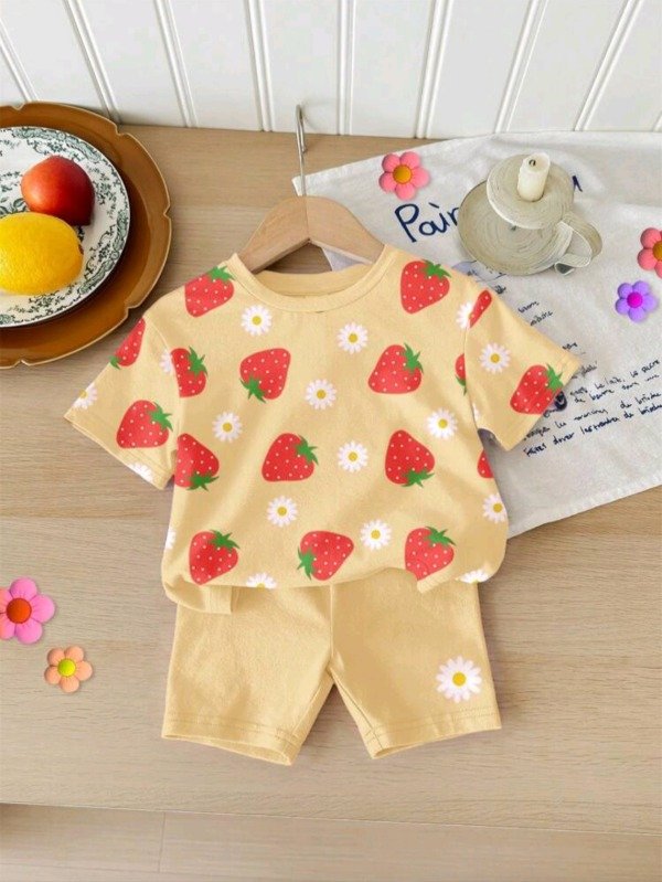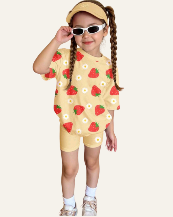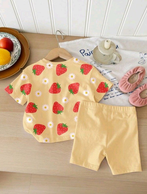 El set Shein original para niña incluye remera y short, con un diseño divertido y tierno inspirado en frutillas . Ideal para uso diario o para regalar, combina comodidad con un estilo moderno y alegre.