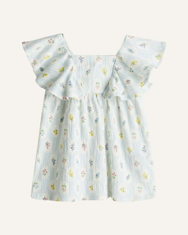Vestido H&M para niña, confeccionado en algodón liviano con textura tipo gasa/crepé, una tela suave, fresca y respirable, ideal para los días de calor.