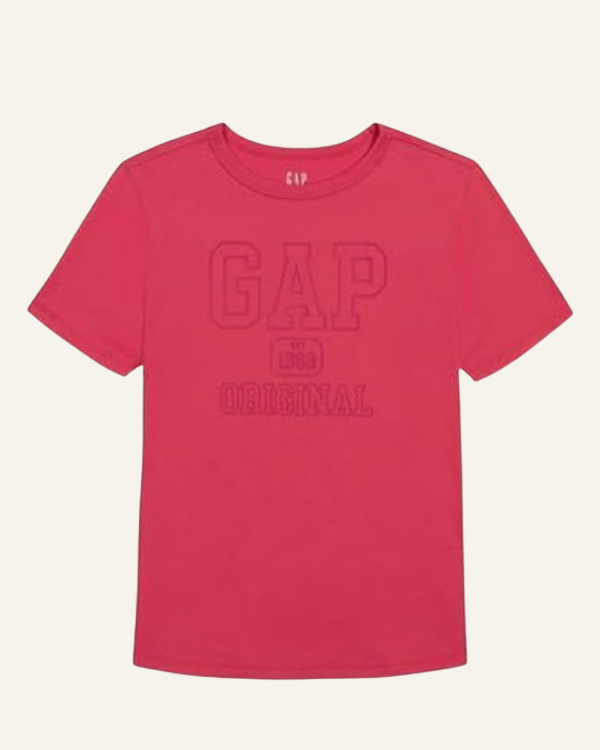 Remera infantil original de GAP, ideal para un look cómodo y moderno. Diseño de manga corta y cuello redondo, con logo GAP estampado en tono sobre tono, que le da un estilo canchero y discreto, fácil de combinar.